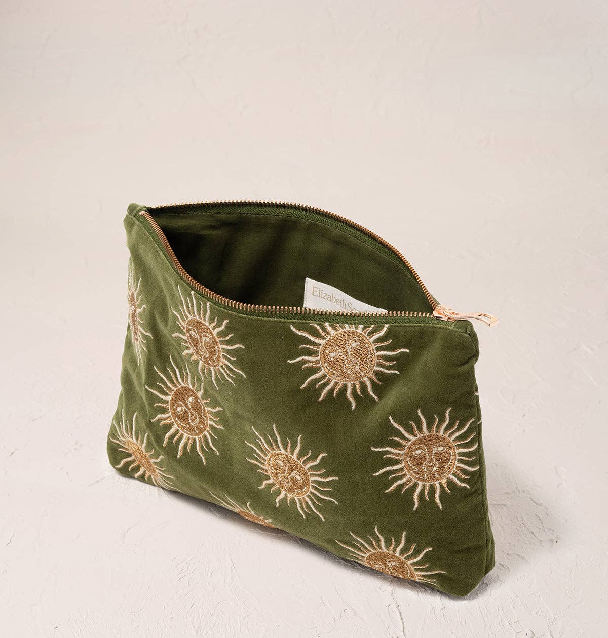 This Pouch is inspired by the warm wonders of our sun. Complete with Elizabeth's hand-drawn sun motif emblazoned onto a soft velvet base, with intricately embroidered gold and vanilla threads. She has depicted the sun with a human-like face, based on imagining the sun as a character.