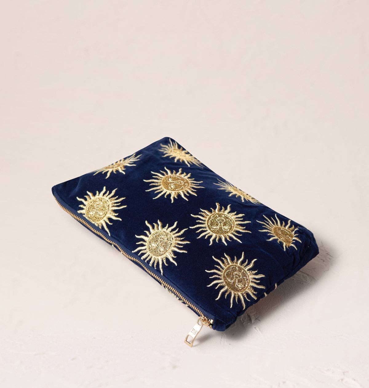 Keep your handbag, beauty and daily essentials perfectly organised with our iconic everyday pouch, or carry it as a clutch for any occasion. Featuring Elizabeth's hand-drawn sun motif, embroidered in vanilla and gold threads with a human-like face that imagines our most powerful star as a gentle being radiating warmth and light.