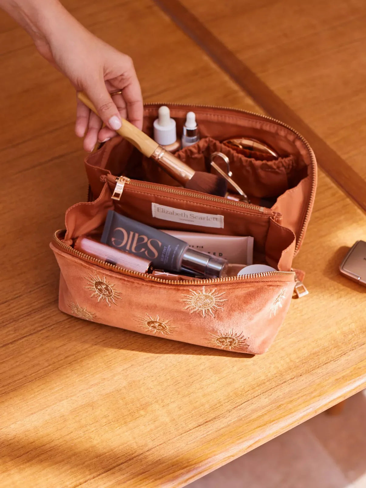 Designed to lay flat on any surface, this bag is an organisational must-have. Complete with a zip-around closure, handy compartments, and a wipeable lining, these bags are designed to elevate your everyday routine. Featuring Elizabeth's hand-drawn sun motif, embroidered in vanilla and gold threads with a human-like face that imagines our most powerful star as a gentle being radiating warmth and light.