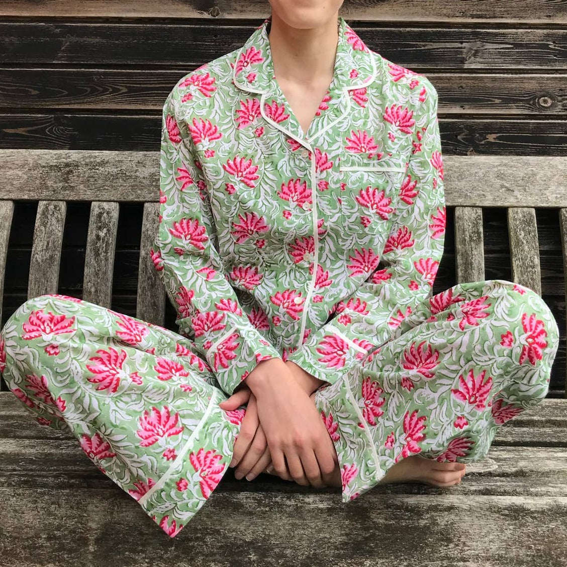 Block Printed Cotton Pajamas "Green and Pink Floral"