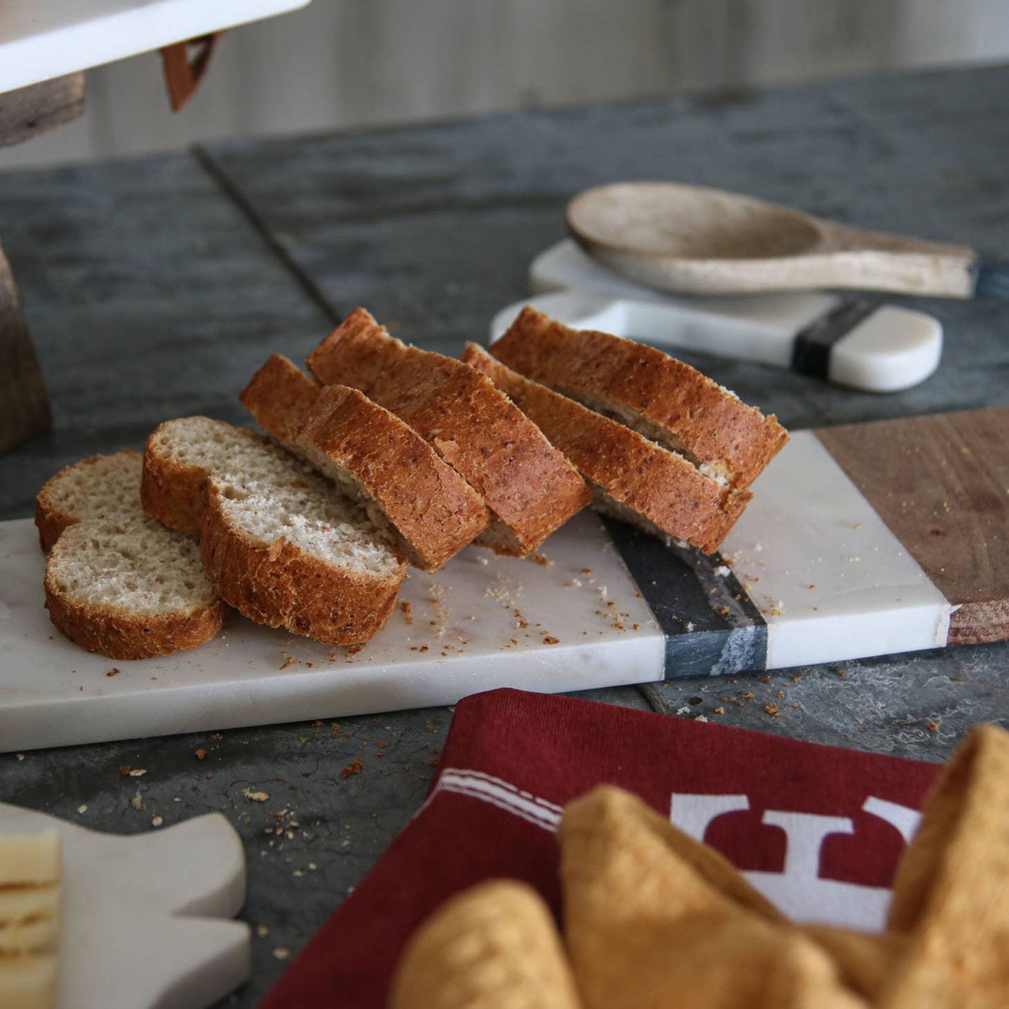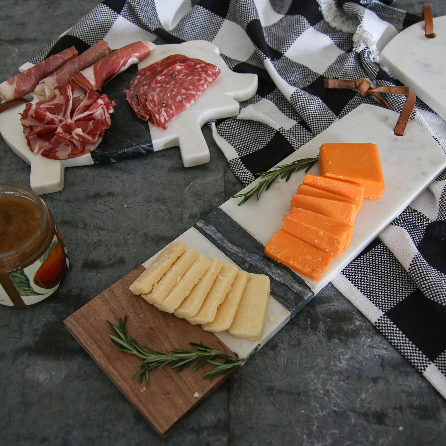 Refresh your modern farmhouse kitchen look with this beautiful cutting board. Characterized by a sophisticated combination of solid white and black marble fused with mango wood, this cutting board is perfect for all of your preparing and serving needs. It has a unique crafted quality that is combined with a basic functional shape, creating an essential piece for entertaining or simply to be displayed as a kitchen accent.